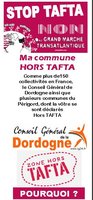 Deux modèles d’une plaquette d’info simplifiée pour informer les habitants d’une commune qui vient de se déclarer Hors TAFTA : "Ma commune Hors TAFTA, Pourquoi ?" une autre indiquant que le CG et d’autres commune du 24 se sont déclarés Hors TAFTA et expliquant pourquoi